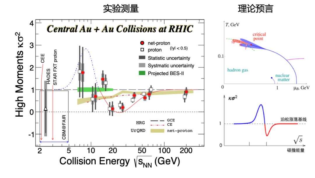 图2,左:STAR实验测量的金金0-5%对心碰撞净质子数和质子数四阶涨落的能量依赖以及非临界模型计算结果。右:重离子碰撞能量扫描的化学冻结线穿过临界区域的示意图,纵坐标是温度,横坐标为重子化学势。当系统穿过临界区域,守恒荷分布的峰度乘以方差随着碰撞能量的改变,围绕泊松分布基线显示出的非单调振荡行为。