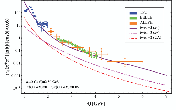 图1: 过程的4类领头阶费曼图。 我们的计算结果表明,在中等能区横向动量效应和twist-3修正均对散射截面有重要贡献。特别值得指出的是,在几个GeV能区这些过程的散射截面由twist-3贡献占主导(如图2所示,对于 过程, ,对于 过程, )。考虑twist-3修正后, 以及 的散射截面值均能较好地与实验测量值相符合。