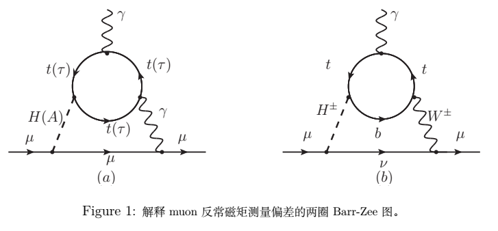 (4) 子反常磁矩在 对称双Higgs二重态模型中的研究 子反常磁矩的长期测量始终与标准模型的理论预言存在3σ左右的偏差。这一长期结果暗示着超出标准模型的新物理效应。在解释这一偏差的新物理模型中,双Higgs二重态模型提供了一种简单的解释。然而这一解释往往需要很轻的中性标量或赝标Higgs 玻色子。换言之,我们需要一对质量差别很大的标量和赝标Higgs 玻色子。但是这样的玻色子会对一些精确测量的观测量带来很大的贡献以致违背了实验测量结果。我们发现,即使在标量和赝标Higgs 玻色子具有类简并质量的条件下,通过两圈Barr-Zee图仍有可能解释muon的反常磁矩测量,而这一质量类简并可以通过U(1)对称性得到。