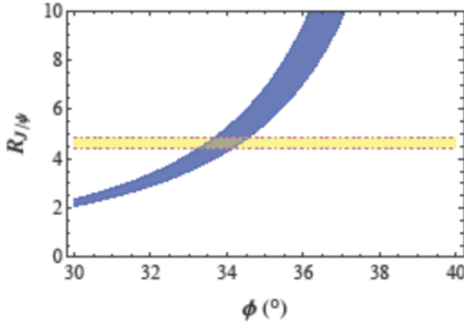 图1:在I类(左)和II类(右)味结构中,相关物理量允许的新物理参数空间。 (8)微扰QCD框架下粲偶素 到 辐射衰变的研究 辐射衰变过程对于检验微扰QCD在粲偶素能区的适用性以及抽取 系统的混合角都起着非常重要的作用。利用轻介子 的光锥分布振幅,在微扰QCD框架下我们详细地研究了辐射衰变过程 (相关的费曼图如图1所示)。借助于螺旋度投影算子方法,我们解析地计算了涉及到的单圈积分。非常有意思的是,我们发现衰变分支比 对轻夸克质量以及 布振幅形状的依赖都不敏感。利用 渐进形式的跃迁形状因子抽取得到的混合参数作为输入,我们计算得到的衰变分支比 与实验测量值相一致。作为交叉检验,我们利用 , 以及它们的实验值,抽取出混合角为 (如图2所示)。 这一结果与利用 渐进形式的跃迁形状因子抽取得到的混合角相一致。