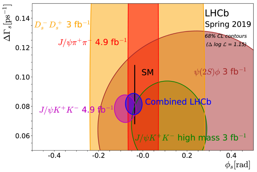 发表文章列表 [1] Z. Su, S. Liu, W. B. Deng, W. Li and X. Cai, Transportation dynamics on networks of heterogeneous mobile agents, Physica A 523 (2019) 1379–1386. 新增或正在主持的基金情况 国家自然科学基金面上项目,“遗忘-记忆传播模型的复杂动力学和相变特征研究”,2019-2022,62万 毕业的研究生人员数及名单 申建民、李志艳、程智胜 参加国际及国内重要会议报告及邀请报告数 第十届海峡两岸统计物理会议,2019年8月12日-16日,台北,淡江大学(1个邀请报告) 第十五届全国复杂网络会议,2019年10月10-12日,江苏,镇江大学(1个分会报告) “神经网络与复杂网络研讨会”,2019年12月2-4日,湖北,三峡大学(1个邀请报告) 下五年计划 积极申请国家自然科学基金面上项目、国际合作项目;加强国际合作,特别是与美国弗吉尼亚理工大学、加拿大瑞尔森大学的合作;在研究方面开拓新的方向,特别是机器学习及在统计物理中的应用。 2.粒子物理实验及理论研究 粒子物理课题组(7名教师:杨亚东、谢跃红、陈绍龙、李新强、尹航、张冬亮、袁兴博;8名博士后:肖栋、Biplab Dey、Maitreyee Mukherjee、胡权宜、张欣、Yu Muramatsu、Shuichiro Funatsu,Amit Dutta Banik, 23名博士生。) 2019年度,粒子物理课题组主要研究进展简述如下。 (1)高精度测量B介子中的CP破坏参数 首次使用了LHCb探测器所收集的13 TeV质子-质子对撞数据,精确测量 介子的CP破坏参数 。CP破坏可以用来解释宇宙中正反物质不对称性,而目前已发现的CP破坏并不足以解释这个现象,因此在实验上发现更多的CP破坏源有着重要的物理意义。文章中使用2011-2012年LHCb探测器所采集的质子-质子对撞数据精确测量 ,属于实验上首次使用LHCb 13TeV的数据来进行测量,取得了目前世界上最为精确的单个实验测量结果( rad,其中第一个误差为统计误差,第二个为系统误差)。将结果与以前的结果合并,并联合更多的衰变道,最终取得了世界上最为精确的 测量值。这篇文章为华中师范大学联合清华大学、爱丁堡大学等国内外单位完成的,测量结果与标准模型预言值一致。文章发表在了【Eur. Phys. J. C 79 (2019) 706】。  (2)在 衰变中确定奇异态强子态 2014年,Belle实验通过 衰变道,在 中发现了一个新的奇异态强子, 。如何在实验上确认奇异态强子的成分变得非常关键,而由于大量的 态的贡献存在,同时由于实验上对这些 粒子的测量精度并不高,因而成为了奇异态强子物理里面的一个难点。文章利用了LHCb探测器在Run1所收集的数据,并使用了4维角度分析来确定奇异态强子的贡献。其中,这个LHCb分析统计量分别是Babar实验所用到数据的40倍,Belle的20倍。在模型无关的分析中,最终并未能确定非 态贡献的准确来源,但是再次确认了在4200MeV有一个形状,同时在4600 MeV也有一个未知的形状。最终确认这些奇异态是否为四夸克态,并最终确定它的性质,需要完整的分波分析。这个分析由华师LHCb组博士后Bipab独立完成,最终发表在了【Phys. Rev. Lett. 122, 152002 (2019)】。