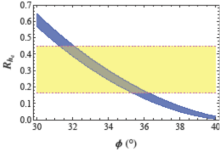 图2:比值 对混合角 的依赖关系。 (9) 衰变过程在 宇称破缺超对称下的研究 在B介子半轻衰变过程中发现了轻子味普适性破坏的一些迹象,基于一些实验上的观测,我们在R宇称破缺超对称下对 反常进行了研究。在这种方案下,下型夸克伴子可以通过树图对 过程产生影响,从而解释 反常现象。除了 过程,我们还研究了 , 过程,对这五个 衰变过程的观测量进行了分析,发现微分分支比比值 , , 在大的双轻子不变质量区域有显著的增强。我们用不同低能味过程最新的实验数据对R宇称破缺超对称的参数进行了约束(见图1),得到了它们之间的相互关联(见图2所示)。