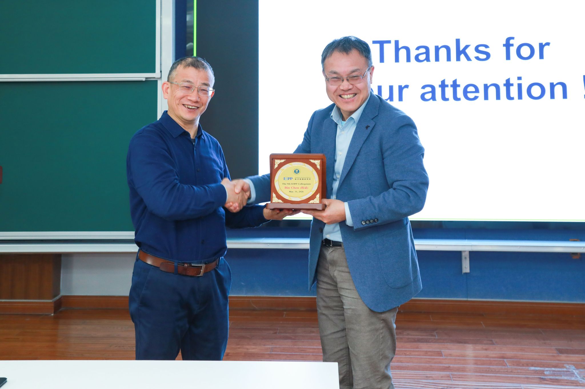 华中师范大学粒子物理研究所所长和华中核理论中心主任王新年教授赠与陈斌教授“第九届粒子所讲坛”纪念奖牌