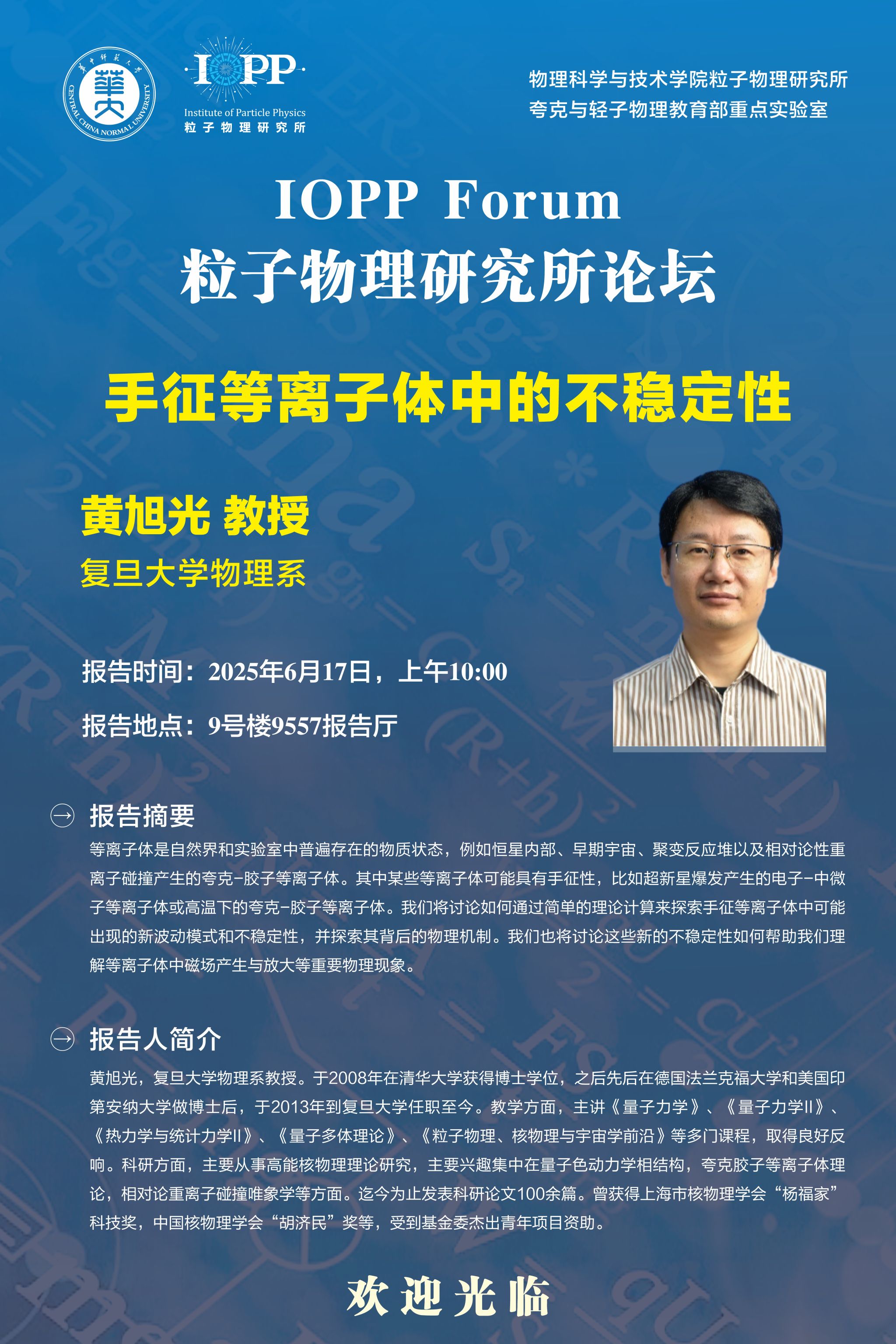 黄旭光,复旦大学物理系教授。于2008年在清华大学获得博士学位,之后先后在德国法兰克福大学和美国印第安纳大学做博士后,于2013年到复旦大学任职至今。教学方面,主讲《量子力学》、《量子力学‖l》、《热力学与统计力学‖》、《量子多体理论》、《粒子物理、核物理与宇宙学前沿》等多门课程,取得良好反响。科研方面,主要从事高能核物理理论研究,主要兴趣集中在量子色动力学相结构,夸克胶子等离子体理论,相对论重离子碰撞唯象学等方面。迄今为止发表科研论文100余篇。曾获得上海市核物理学会“杨福家”科技奖,中国核物理学会“胡济民”奖等,受到基金委杰出青年项目资助。