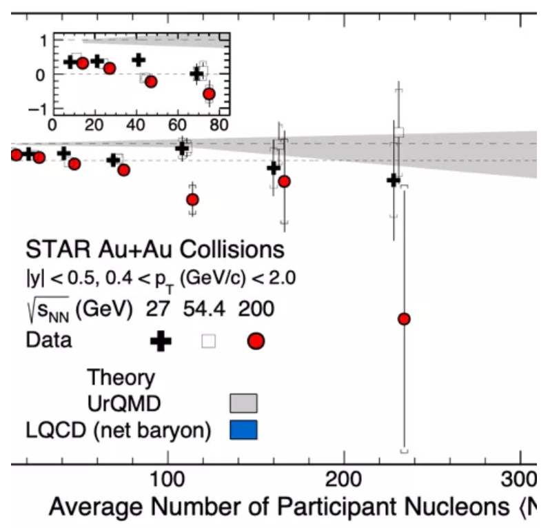 STAR重离子碰撞实验中金金碰撞净质子数六阶涨落的中心度依赖。红色点为质心能量200 GeV的结果,从擦边碰撞到中心碰撞逐渐变为负值。27 GeV和54.4 GeV的实验结果在误差范围接近于0。灰色和蓝色区域分别代表输运模型UrQMD和格点QCD计算结果。内嵌图为40-80%中心度的放大显示。