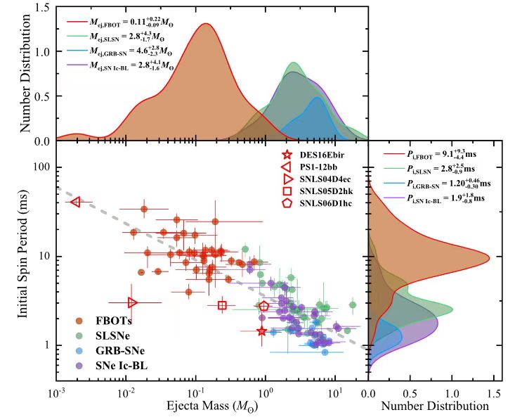 近年来,随着宽视场、高频率观测技术在时域天文观测领域的广泛应用,天文学家发现了一类演化非常快速同时又非常明亮的光学暂现源,通常称为快变蓝色光学暂现源(简称FBOT)。FBOT的辐射可以在几天内就达到与普通超新星峰值光度相当乃至更高的程度,因而对其物理起源和能源机制的解释成为了当前天文学研究的一大难题。俞云伟教授领导的课题组曾于2015年率先提出了FBOT的毫秒磁陀星能源模型,并在随后数年内探讨了多种可能的磁陀星形成通道。在此次研究工作中,他们进一步基于PS1-DMS、DES-SN、SNLS、HCSSP以及PTF各大暂现源巡天观测项目的观测结果,实现了对FBOT较大样本的批量拟合和统计分析,从而发现了FBOT磁陀星旋转周期和爆发抛射物质量之间的反相关关系,并据此揭示了FBOT和超亮超新星、宽线Ic型超新星以及伽马暴成协超新星之间的紧密联系(如图1所示)。基于现有的恒星演化模拟结果,Mej-Pi反相关关系预示着这几类特殊的极端恒星爆发现象可能均源自于致密星-恒星双星系统,致密星伴星对不同类型恒星的潮汐作用是导致极端爆发的主要原因,这位最终揭示FBOT的起源提供了重要线索和方向。