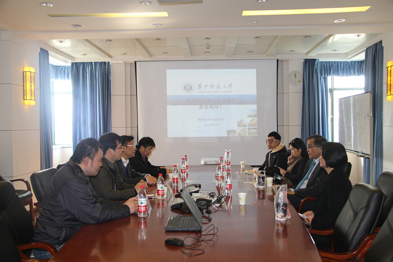 2016年3月11日,澳门大学全球事务总监兼校长顾问冯达旋,澳门大学全球事务办公室内地事务主任汪琪一行参访我院,华中师范大学港澳台办主任王琍陪同,物理学院分党委书记陈迪明,常务副院长杨亚东,副院长黄光明,教授孙向明与来访贵宾进行座谈交流。