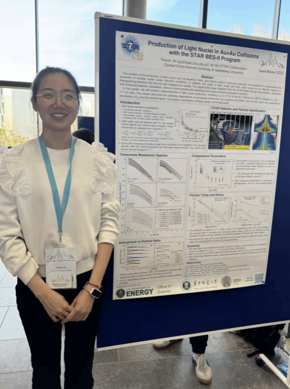 金宜萱同学的研究海报《Production of light nuclei in Au+Au collisions with the STAR BES-II program》因其创新的研究思路和出色的展示效果获得大会最佳海报奖,获邀在"Flash Talk"环节进行报告,向国际同行展示这一重要研究成果。