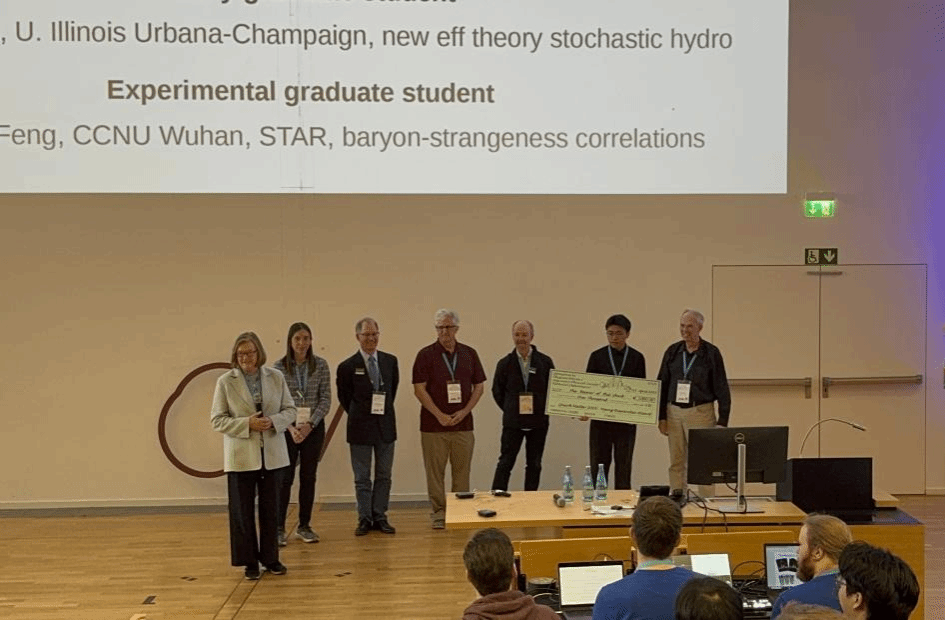 据悉,本次两位获奖者均为我院粒子物理研究所STAR组博士生。华师STAR课题组由许怒教授和刘峰教授牵头,包含施梳苏、王亚平、罗晓峰三位教授以及30余名研究生,STAR课题组在本届会议上表现突出,共贡献5个分会报告和12个学术海报,充分展现了华中师范大学在高能核物理领域的科研实力。我校物理科学与技术学院粒子所近年来与CERN、BNL等国际顶尖科研机构保持深度合作,此次获奖进一步提升了学校在高能核物理领域的国际影响力。
