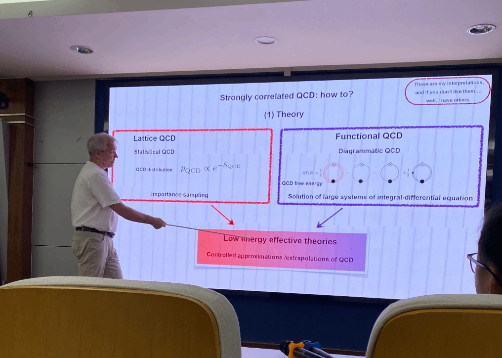 Pawlowski教授的报告从量子色动力学(QCD)的基本理论切入,系统阐释了QCD在不同能标下的行为特征。他指出,在高能条件下QCD表现为弱相互作用的夸克和胶子理论,而在低能条件下则进入强关联区域,出现手征对称性破缺和色禁闭现象。报告重点展示了多项前沿研究成果:通过夸克凝聚揭示了350MeV能标下的质量生成过程,为理解QCD低能行为提供了关键依据;深入探讨了QCD相图中的临界点(CEP)寻找问题,特别是在相结构研究中护城河"(Moat regime)点新概念;结合重离子碰撞实验数据,分析了如何通过重子数涨落捕捉临界点的"涟漪效应",展现了理论与实验的深度融合。