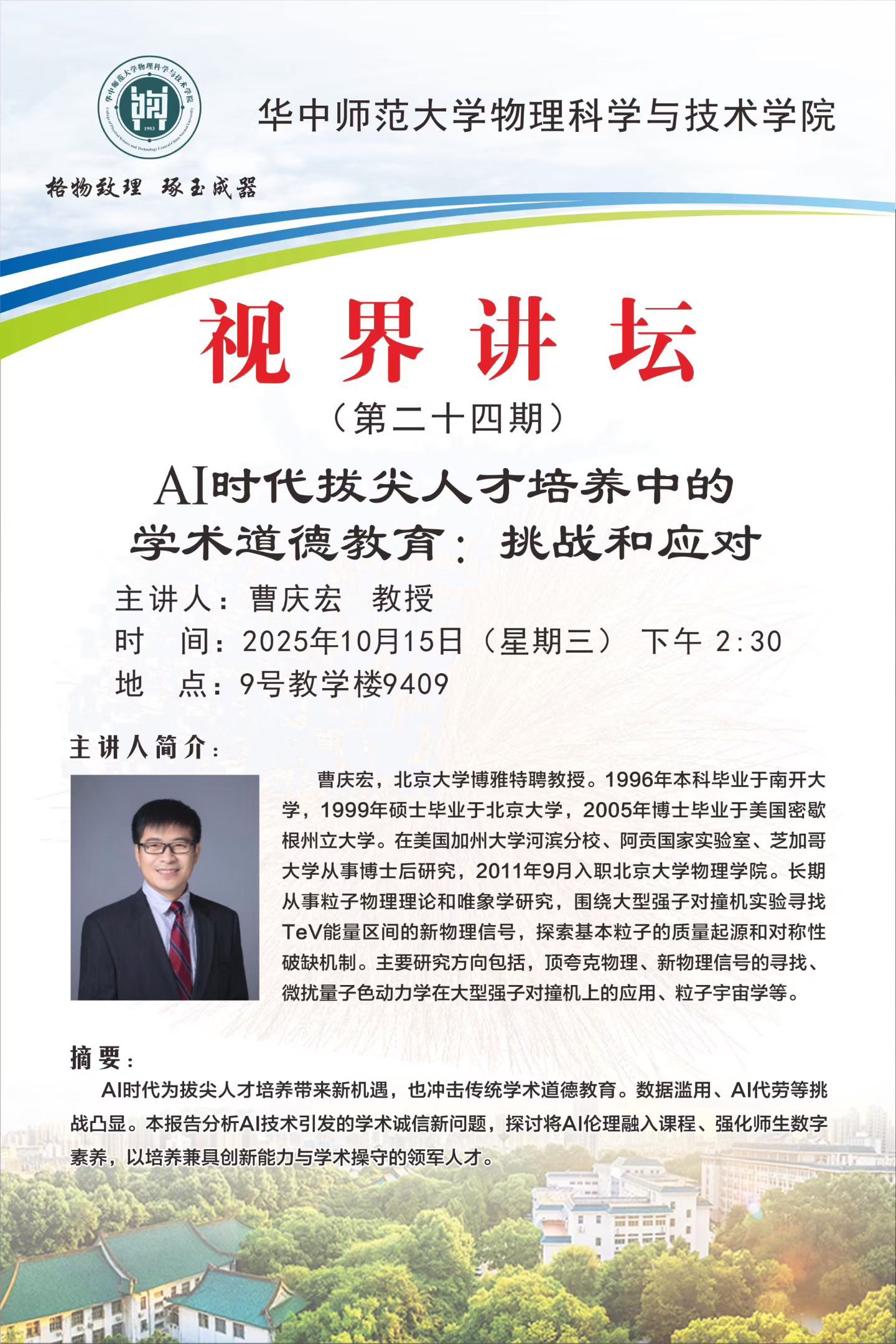 曹庆宏,北京大学博雅特聘教授。1996年本科毕业于南开大学,1999年硕士毕业于北京大学,2005年博士毕业于美国密歇根州立大学。在美国加州大学河滨分校、阿贡国家实验室、芝加哥大学从事博士后研究,2011年9月入职北京大学物理学院。长期从事粒子物理理论和唯象学研究,围绕大型强子对撞机实验寻找TeV能量区间的新物理信号,探索基本粒子的质量起源和对称性破缺机制。主要研究方向包括,顶夸克物理、新物理信号的寻找、微扰量子色动力学在大型强子对撞机上的应用、粒子宇宙学等。